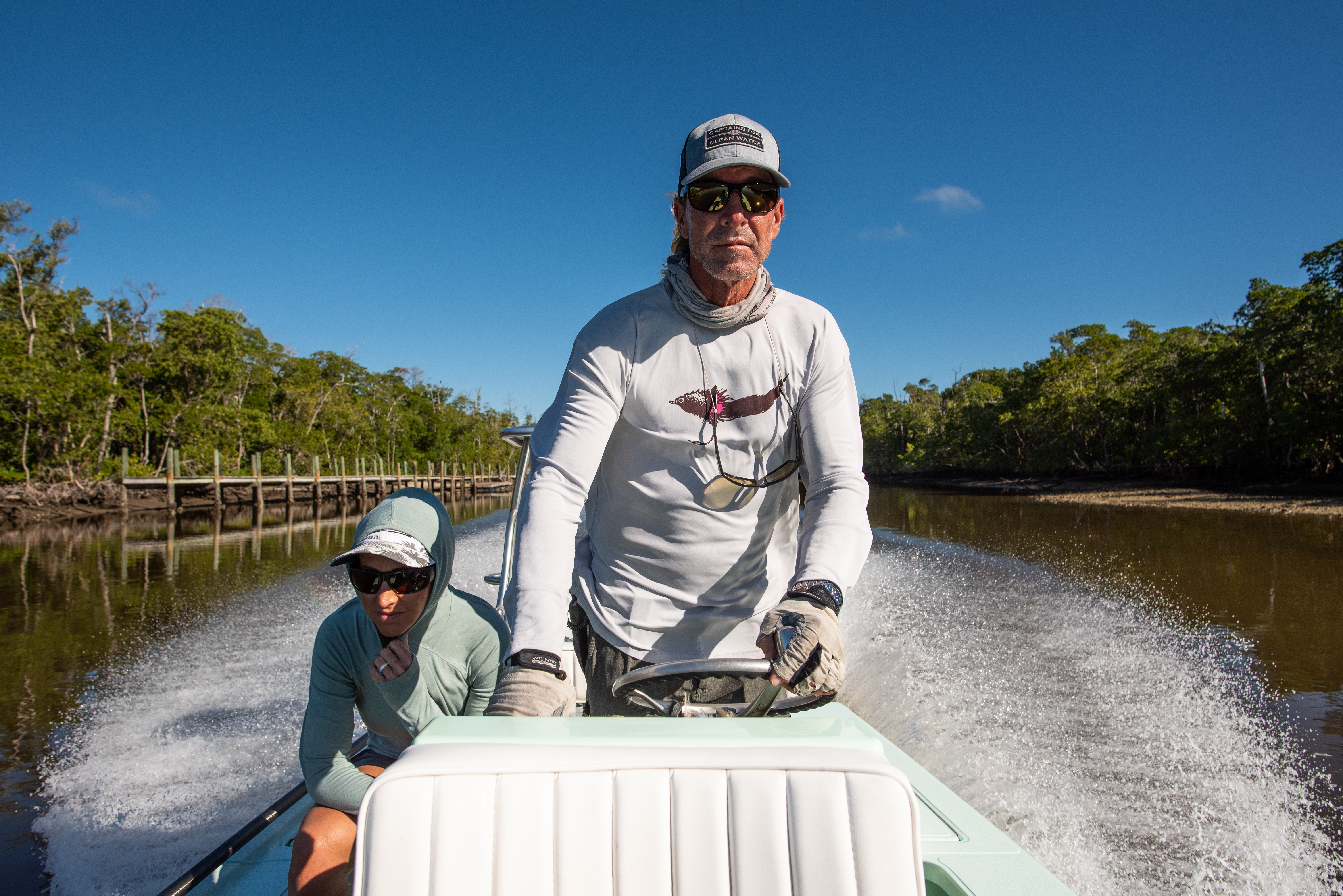 Early on a humid April morning, I find myself sleepily observing the creatures of the Wawa gas station, waiting for Jeff to pull in and fuel up. He and his wife Christina arrive at 5:00 AM on the dot, towing his guide green Hell’s Bay Professional. He fuels the boat up and loads Arizona Ice Tea into the cooler, with a casual familiarity unique to locals—he knows what aisle holds his tea, has a favorite pump—and starts the 30-minute drive to the boat ramp by 5:15.