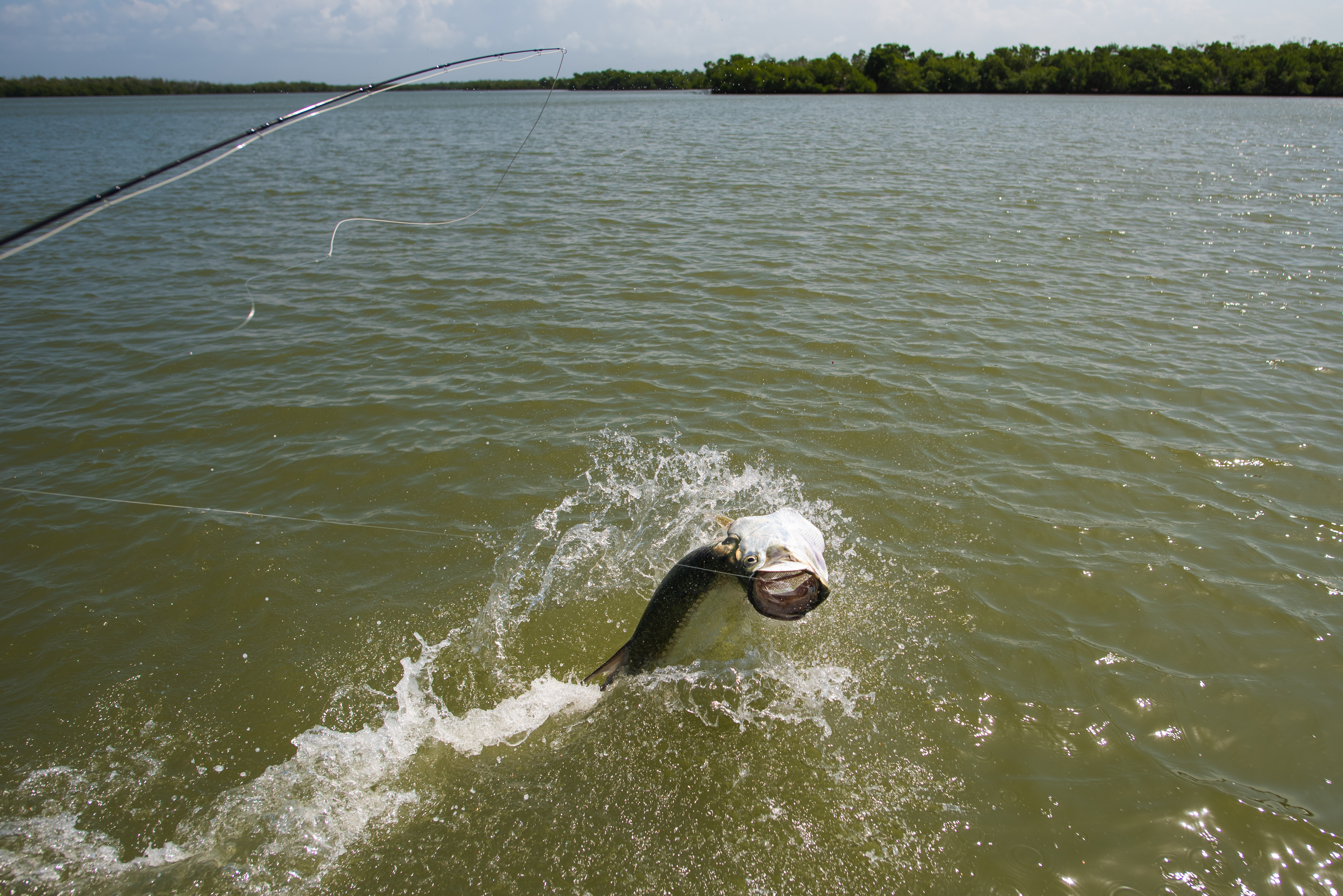 The afternoon sea breeze turned on as we ripped south to the next spot. The wind was fighting the falling tide, and white caps moved in from the channel. We escaped from the turbulent pass into a basin with slightly dirty water. When the wind turns out of the South or West in the Everglades, the water starts to resemble chocolate milk. This can make it more difficult to see fish but they tend to eat a lot better in those water conditions. I continued to pole slowly and with purpose, suddenly spotting a laid up tarpon 30 feet at 11 o’clock. In this game, you must be fast, accurate, and stealthy at a moment’s notice and that is exactly what Jeff preaches. His fly landed softly and right in the zone, the tarpon felt it instantly – surging upwards at the fly and coming tight. This fish wasn’t as lucky as the first one and was hooked right on the button, the center of the upper jaw.
