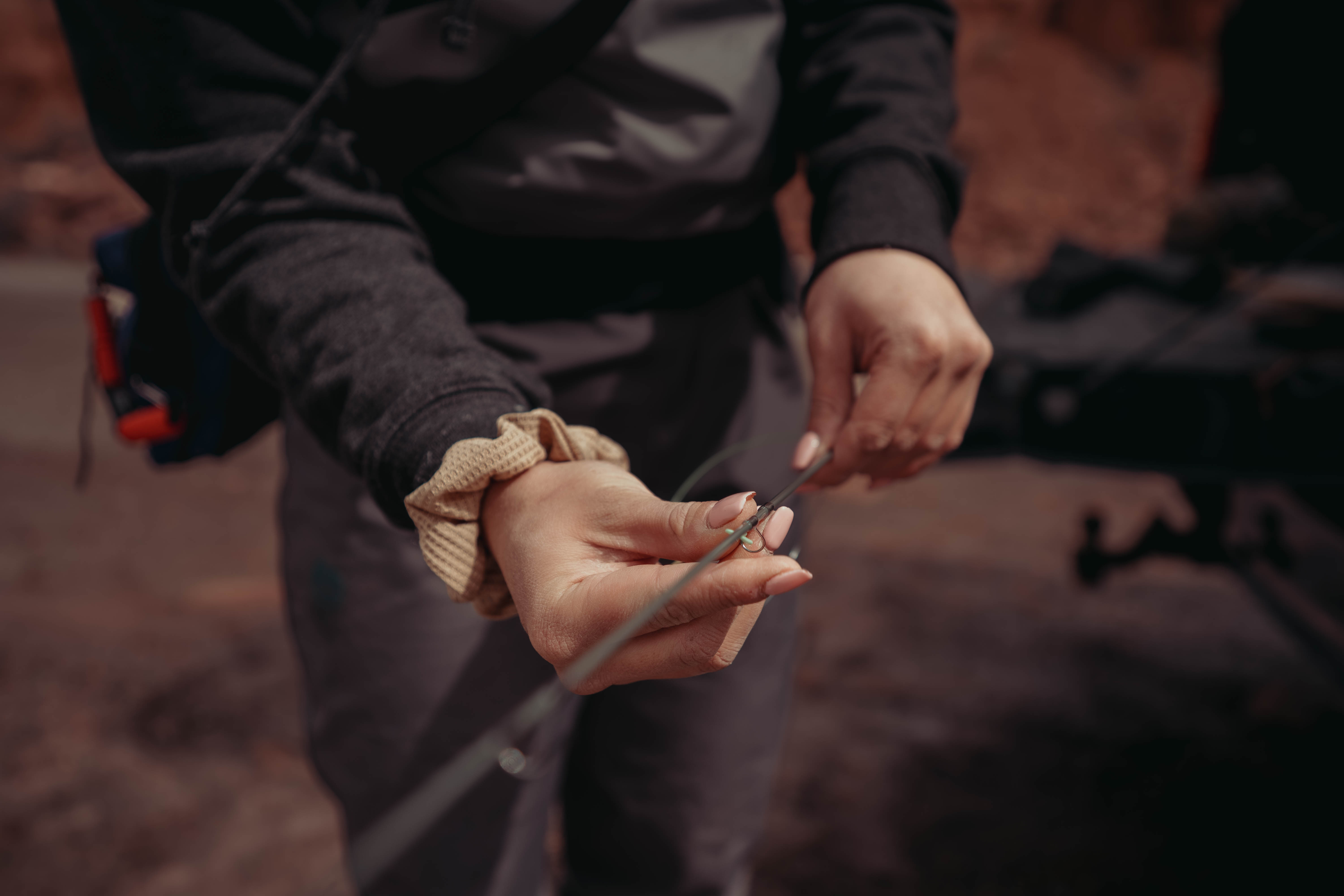 Instead of starting with the bottom piece of your rod and working your way up, start with the top pieces and work your way down. It makes it easier to line up your guides and will prevent you from reaching awkwardly to set up the whole rod. Once set up, pull off enough line from your reel so you’re able to pinch and loop it through your guides. This will prevent you from dropping your line as you pull it through your rod.