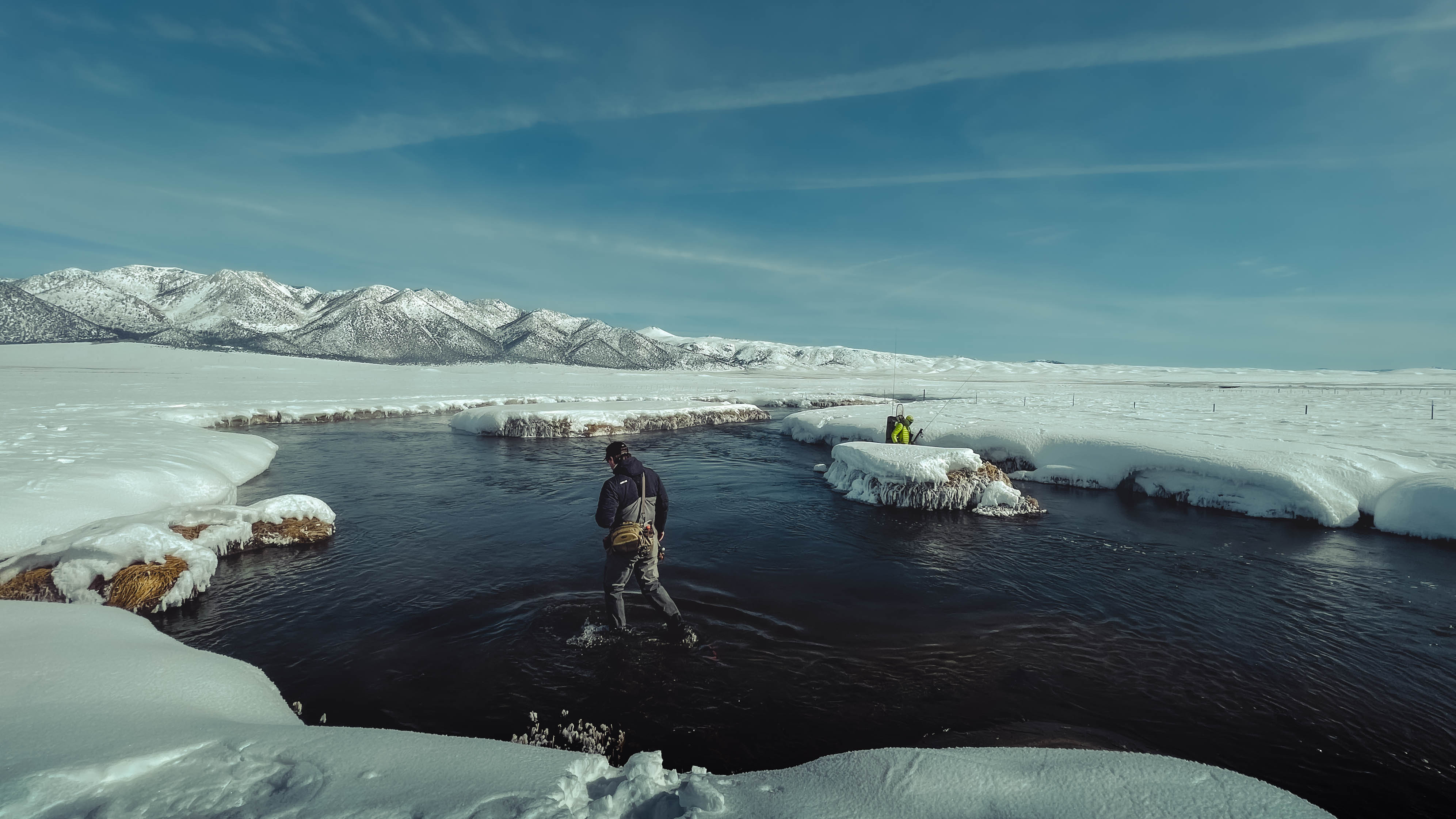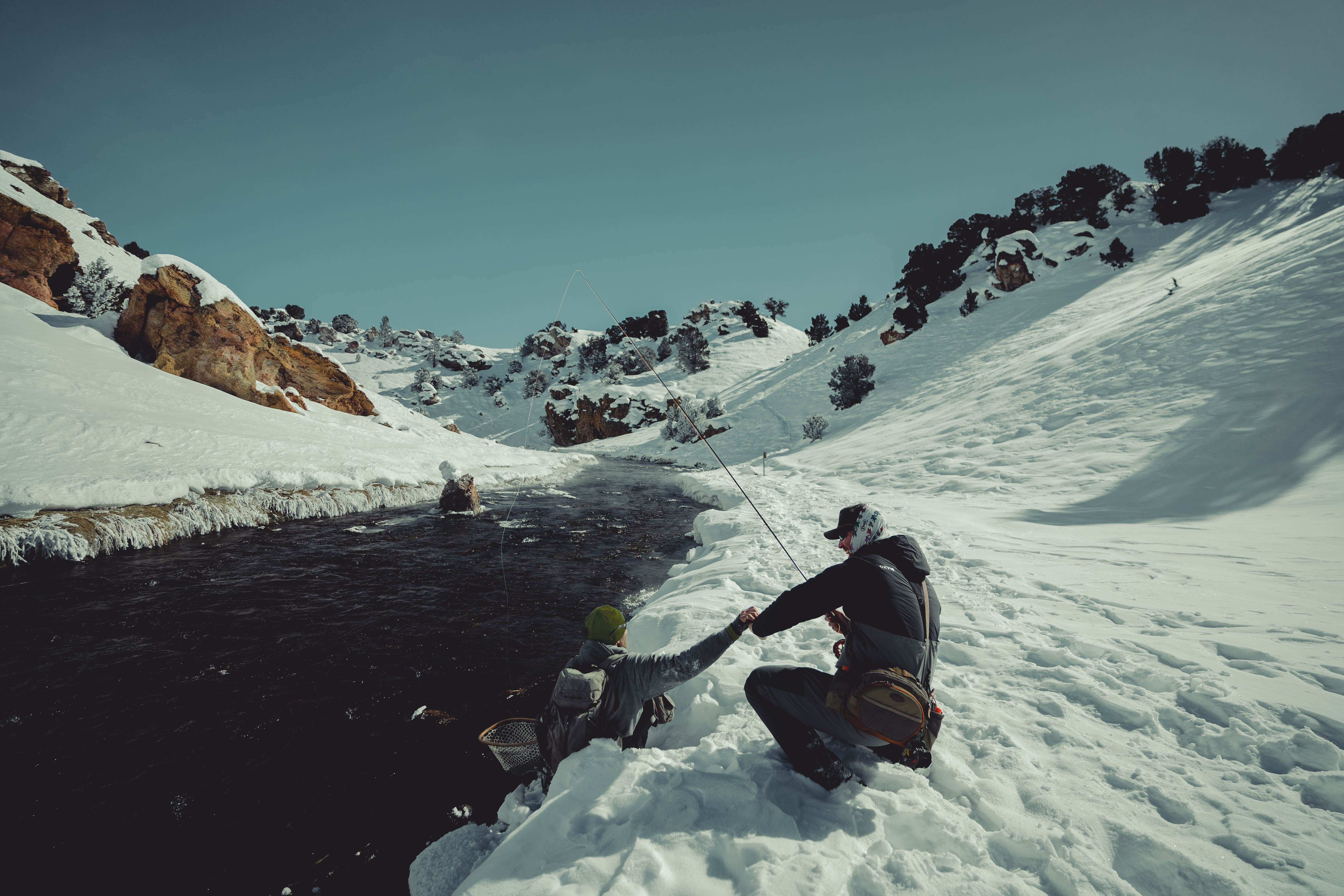 Two men winter fly fishing
